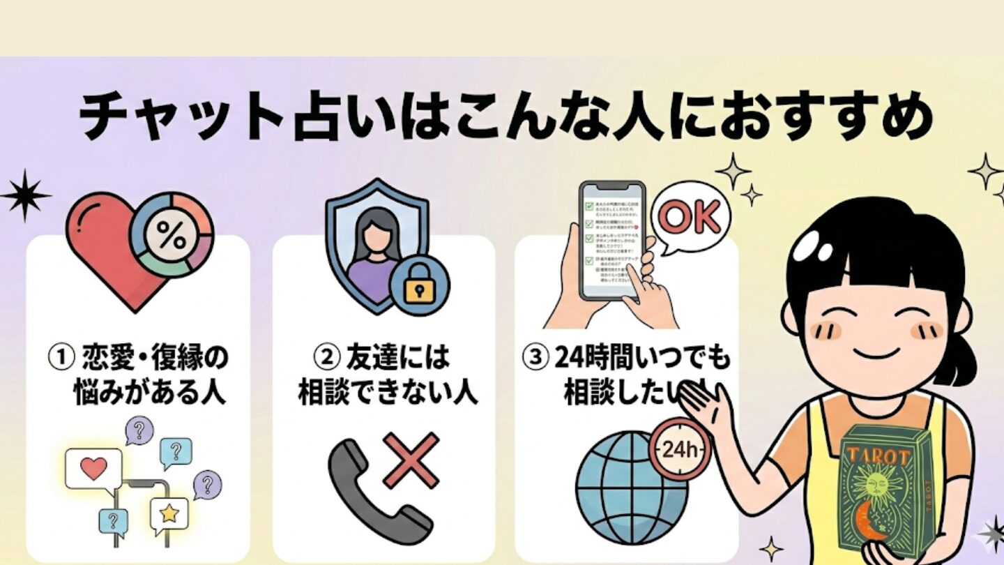 恋愛全般・夫婦関係など広い | 文字チャット中心、ライト寄り | 文字数課金・比較的安めと言われることが多い | まずチャット占いを試したい/気軽に相談したい人 |